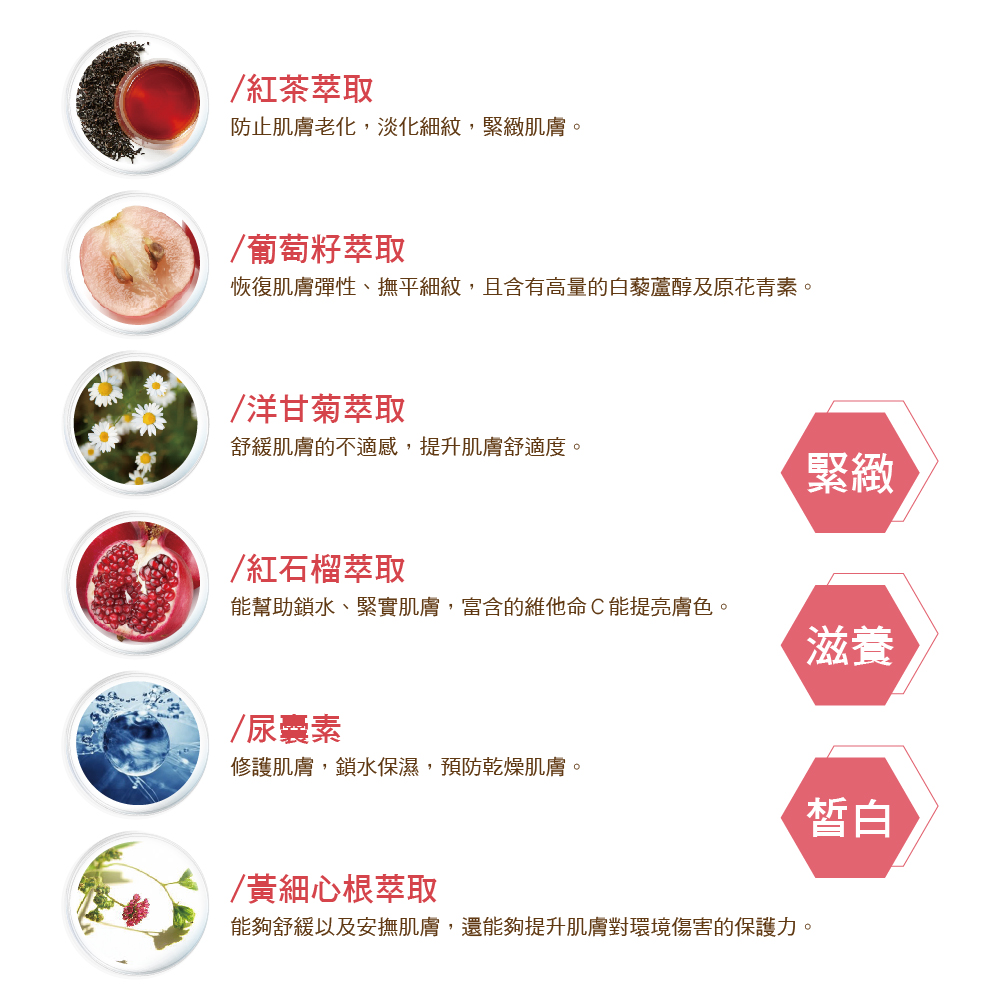 紅茶萃取、山茶花萃取、洋甘菊萃取、葡萄籽萃取、紅石榴萃取