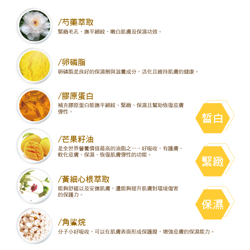 芒果籽油、膠原蛋白、芍藥萃取、角鯊烷、卵磷脂