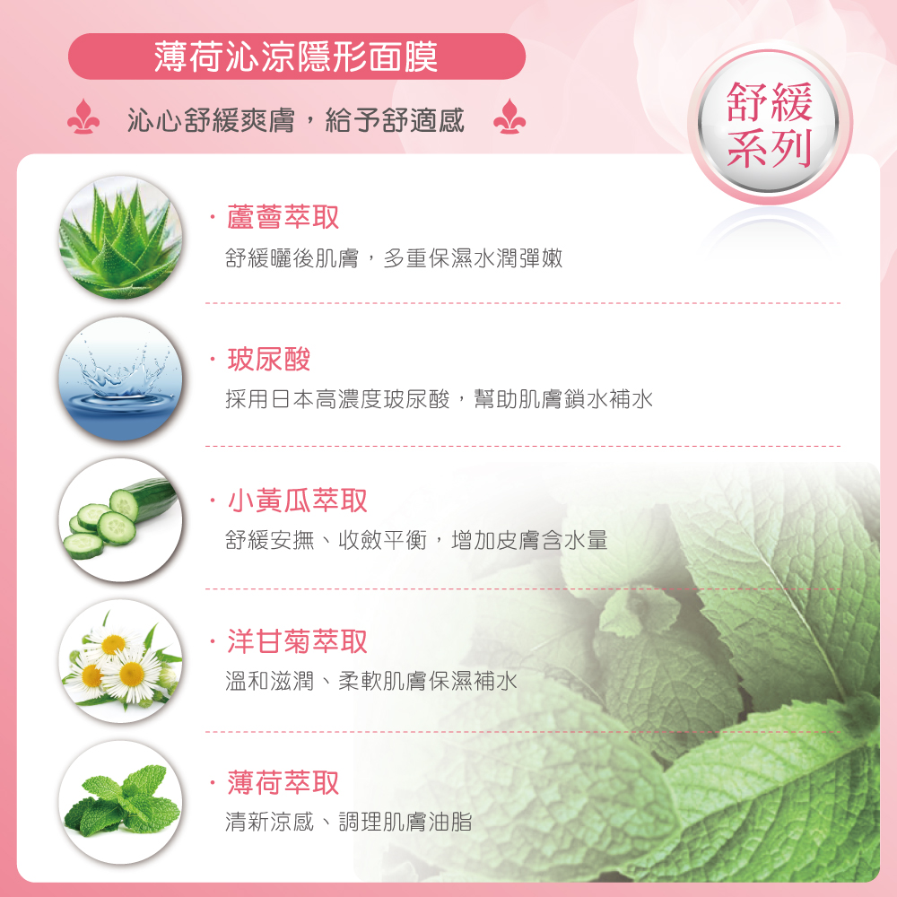 薄荷萃取、蘆薈萃取、小黃瓜萃取、洋甘菊萃取、玻尿酸