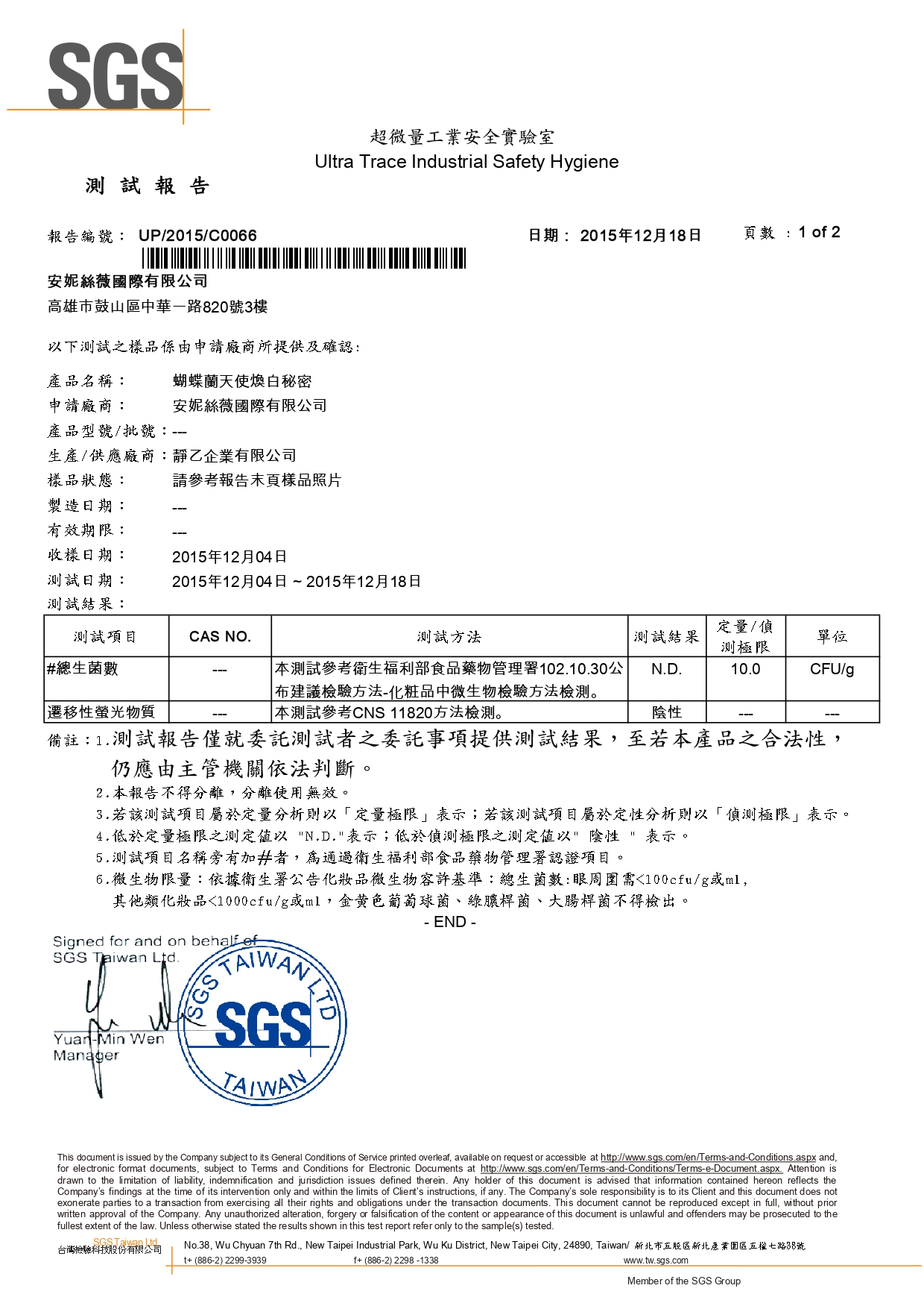 產品通過S.G.S.檢驗總生菌合格