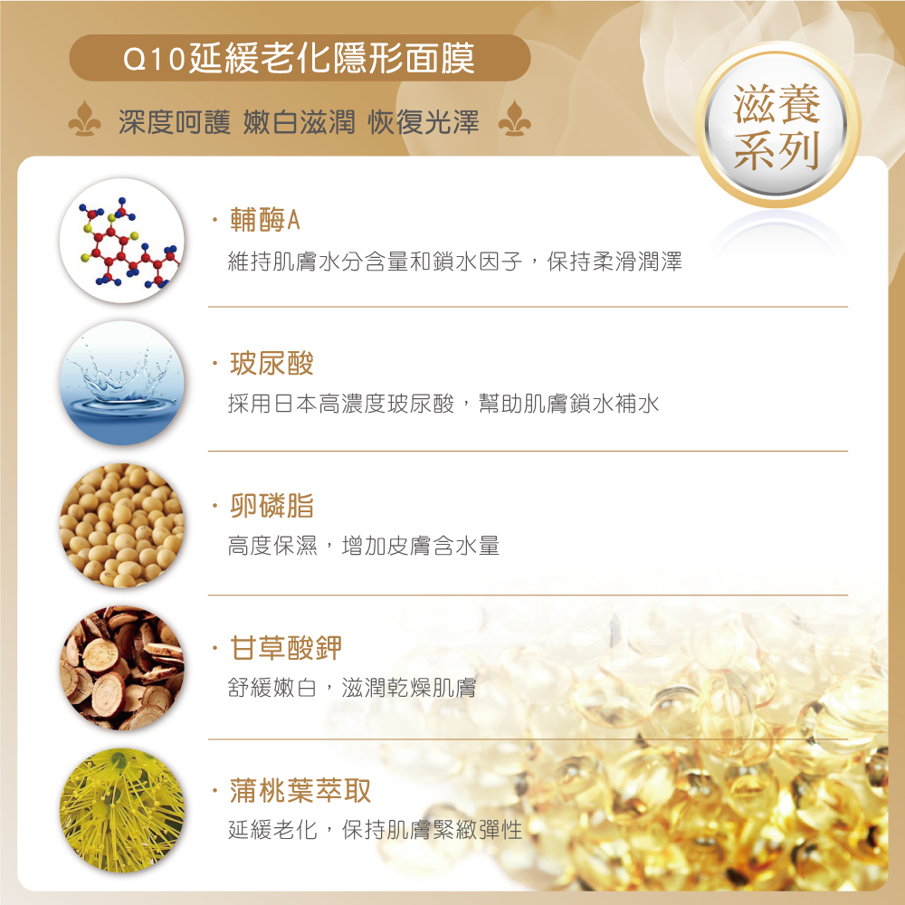 Q10 深層保濕呵護,嫩白滋潤、恢復光澤,延緩老化,使肌膚彈性緊緻
